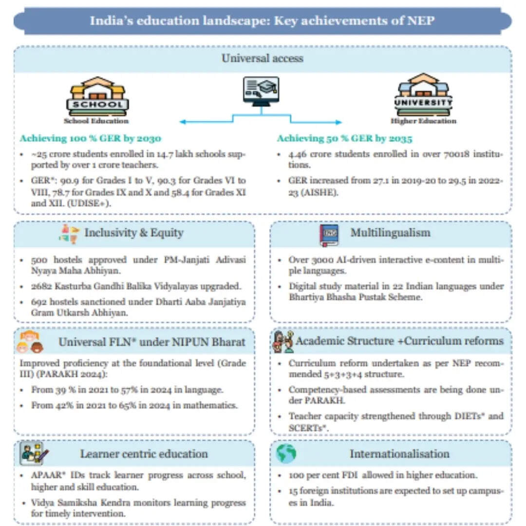 आर्थिक सर्वे 2025–26 के मुताबिक राष्ट्रीय शिक्षा नीति (NEP) के तहत भारत की शिक्षा व्यवस्था में व्यापक स्तर पर संरचनात्मक सुधार किए गए हैं। स्कूल शिक्षा में 2030 तक 100% Gross Enrolment Ratio (GER) हासिल करने का लक्ष्य रखा गया है। फिलहाल देश में 14.7 लाख स्कूलों में करीब 25 करोड़ छात्र नामांकित हैं, जिन्हें 7 करोड़ से ज्यादा शिक्षक पढ़ा रहे हैं। कक्षा I से V तक GER 90.9%, कक्षा VI से VIII में 90.3%, जबकि कक्षा IX–X में 78.7% और XI–XII में 58.4% तक पहुंच चुका है।