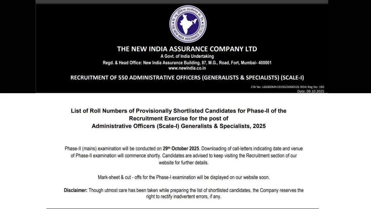 NIACL AO Result 2025 Declared: न्यू इंडिया एश्योरेंस कंपनी लिमिटेड ने जनरलिस्ट और स्पेशलिस्ट परीक्षा का परिणाम जारी कर दिया है। इन रिजल्ट को आज 9 अक्टूबर 2025 को जारी किया गया है। इस लिखित परीक्षा में शामिल हुए उम्मीदवार NIACL की आधिकारिक वेबसाइट newindia.co.in पर जाकर परिणाम देख सकते हैं। हालांकि खबर में भी रिजल्ट देखने के लिए डायरेक्ट लिंक दिया गया है।
