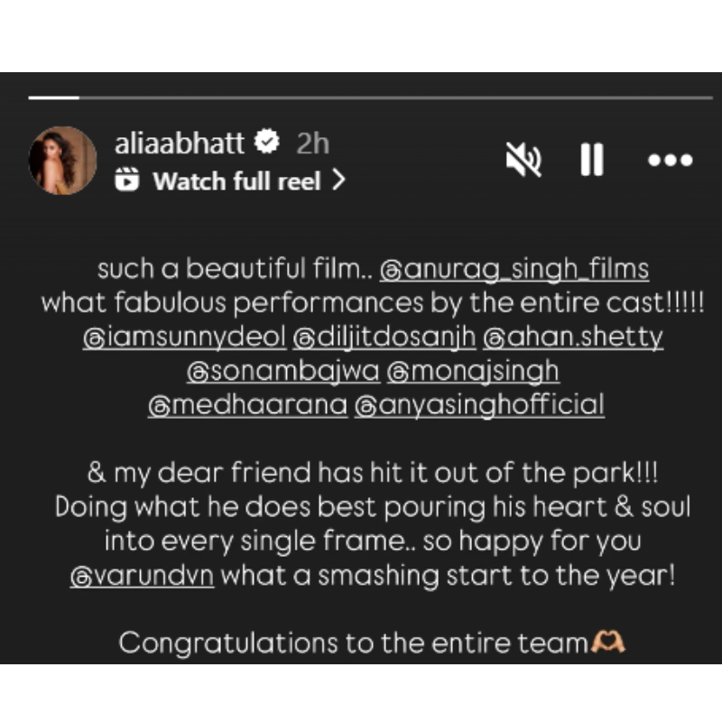 एक्ट्रेस आलिया भट्ट (Alia Bhatt) इंस्टाग्राम पर स्टोरी शेयर करते हुए लिखती हैं, 'इतनी खूबसूरत फिल्म.. बॉर्डर 2 (Border 2) की पूरी कास्ट ने क्या शानदार परफॉर्मेंस दी है!!!!! और मेरे प्यारे दोस्त वरुण धवन ने कमाल कर दिया!!! वो कर रहा है जो वो सबसे अच्छा करता है, हर एक फ्रेम में अपना दिल और आत्मा डाल रहा है.. तुम्हारे लिए बहुत खुश हूं। साल की क्या ज़बरदस्त शुरुआत है! पूरी टीम को बधाई।' आलिया भट्ट के इस पोस्ट से साफ हो गया है कि वो आम जनता की तरफ फिल्म 'बॉर्डर 2' की फैन हो गई हैं। आलिया भट्ट ने दोस्ती निभाते हुए वरुण धवन (Varun Dhawan) की जमकर तारीफ कर डाली। जैसा की आपको मालूम है आलिया और वरुण ने फिल्म 'द स्टूडेंट ऑफ दी इयर' से बॉलीवुड डेब्यू किया था। दोनों की ऑनस्क्रीन के साथ-साथ ऑफस्क्रीन भी काफी अच्छी बान्डिंग है।