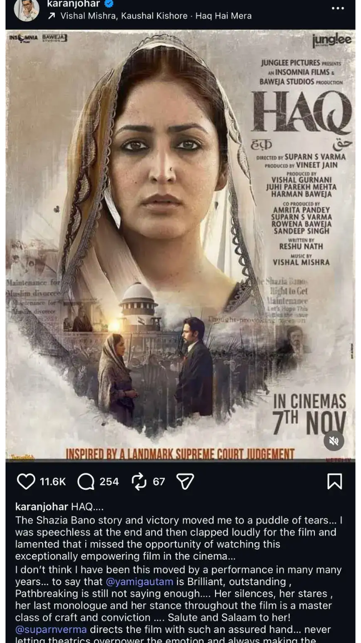 मशहूर निर्माता-निर्देशक करण जौहर ने अपने ऑफिशियल इंस्टाग्राम हैंडल पर पोस्ट शेयर करते हुए लिखा, 'हक... शाजिया बानो की कहानी और उनकी जीत ने मुझे इतना भावुक कर दिया कि मेरी आंखें नम हो गई हैं... लास्ट में मैं खुद हैरान रह गया और फिल्म देखकर खूब तालियां बजाईं। अफसोस इस बात का है कि मैं इस मूवी को सिनेमाघर में देखने से चूक गया... मुझे नहीं लगता कि इतने सालों में किसी अभिनय ने मुझे इतना प्रभावित किया है...यामी गौतम बेहद शानदार, उत्कृष्ट और उनकी परफॉर्मेंस दमदार रही... उनकी खामोशी, उनकी निगाहें, उनका आखिरी डायलॉग और पूरी फिल्म में उनका हावभाव कला और विश्वास का एक उत्कृष्ट उदाहरण है... उन्हें सलाम!'