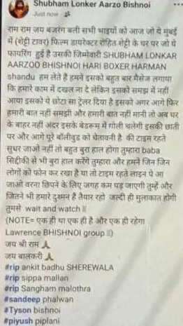 इस पोस्ट में आगे लिखा है, 'ये सिर्फ एक छोटा सा ट्रेलर है। अगर वो नहीं माने तो अगली गोलियां घर के बाहर नहीं, बल्कि उनके बेडरूम में उनके सीने में लगेंगी। पूरी बॉलीवुड इंडस्ट्री को चेतावनी है सुधार जाओ, वरना बाबा सिद्दीकी से भी बुरा हाल होगा। जिन्हें हमने कॉल किया है, लाइन में आ जाओ वरना छिपने की जगह नहीं मिलेगी। दुश्मनों के लिए इंतजार करो, देखते रहो। (नोट: था सिर्फ एक, है सिर्फ एक और रहेगा सिर्फ एक – लॉरेंस बिश्नोई ग्रुप) पोस्ट वायरल होते ही मुंबई पुलिस और क्राइम ब्रांच ने शहर में बड़े पैमाने पर छापेमारी शुरू कर दी है। फॉरेंसिक टीम मौके पर पहुंचकर जांच कर रही है। आसपास के सीसीटीवी फुटेज भी चेक किए जा रहे हैं।
