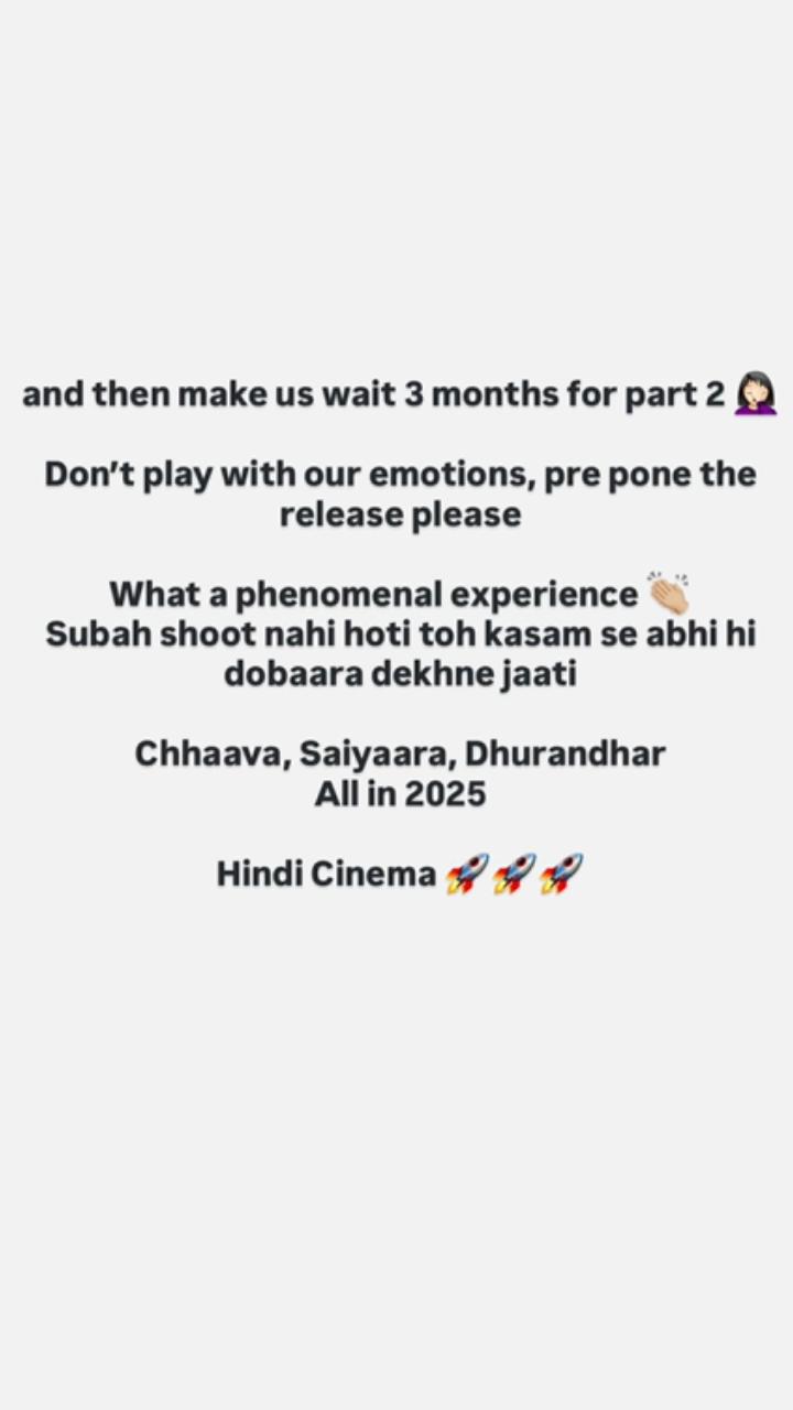 श्रद्धा कपूर ने सोमवार को अपने इंस्टाग्राम पर 'धुरंधर' देखने के बाद अपना रिएक्शन दिया। पहली स्लाइड में श्रद्धा कपूर ने लिखा, 'आदित्य धर का 'धुरंधर' जैसी फिल्म बनाना वाकई टेरिबल है।' दूसरी स्लाइड में उन्होंने आगे लिखा, 'और फिर हमें पार्ट 2 के लिए तीन महीने इंतजार करवाया जा रहा है। हमारी भावनाओं के साथ खिलवाड़ मत करो, कृपया फिल्म की रिलीज को पहले कर दो। क्या शानदार एक्सपीरियंस था! सुबह शूटिंग न होती तो कसम से दोबारा देखने जाती। छावा, सैयारा, धुरंधर – ये सभी 2025 के हिंदी सिनेमा में देखने को मिलेंगी।'