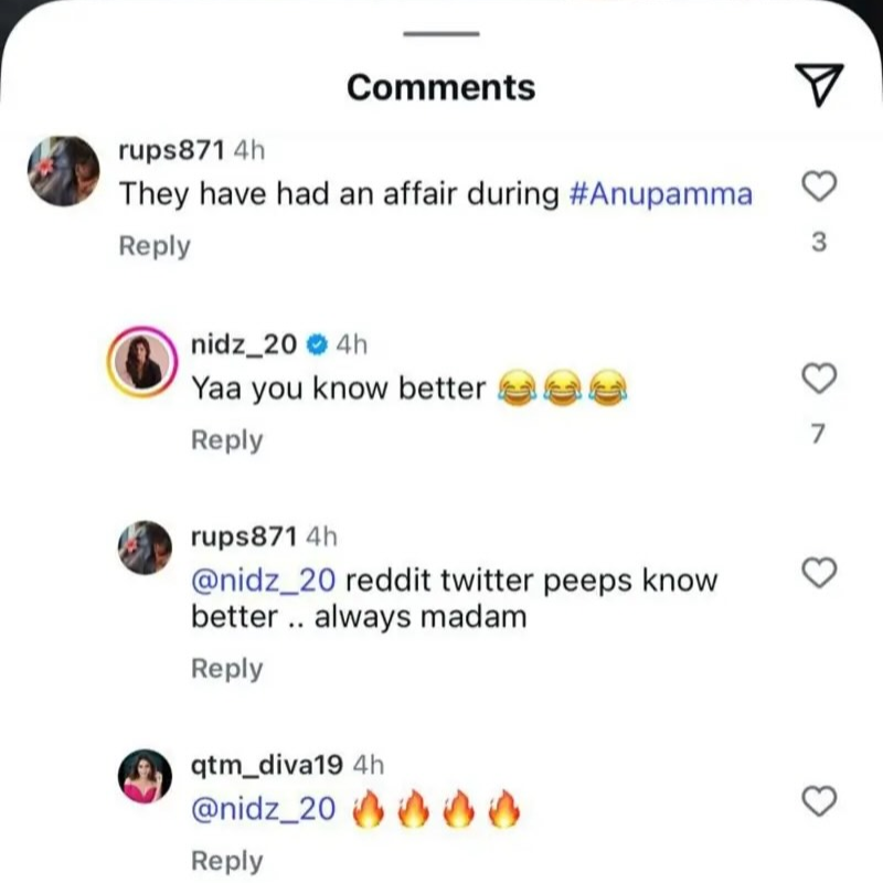 सोशल मीडिया पर एक पोस्ट वायरल हो रहा है जिसमें एक यूजर ने कमेंट सेक्शन में लिखा, 'अनुपमा के दौरान निधि शाह (Nidhi Shah) और गौरव खन्ना का एक दूजे के साथ अफेयर था।' ऐसे में इस पर खुद निधि ने जवाब देते हुए लिखा डाला कि हाँ, आप बेहतर जानते हैं। फिर वही यूजर लिखता है, 'निधि रेडिट ट्विटर वाले बेहतर जानते हैं.. हमेशा मैडम।' ऐसे में हर कोई हैरान परेशान है कि क्या सच में शादीशुदा गौरव खन्ना का चक्कर निधि संग था। सीरियल 'अनुपमा' में गौरव खन्ना ने अनुज कपाड़िया तो निधि शाह ने निभाया था किंजल शाह का किरदार। दोनों ने सेट पर कई रील्स बनाकर इंस्टाग्राम पर शेयर भी की थी जो अब इस दावे के बाद वायरल हो रही हैं। शो 'बिग बॉस 19' (Bigg Boss 19) के दौरान गौरव खन्ना (Gaurav Khanna) के दिल में पत्नी आकांक्षा चमोला को लेकर प्यार और इज्जत को देख फैंस एक्टर के दीवाने हो गए थे। ऐसे में ऐसी खबरों ने उन फैंस को मायूस कर दिया है।