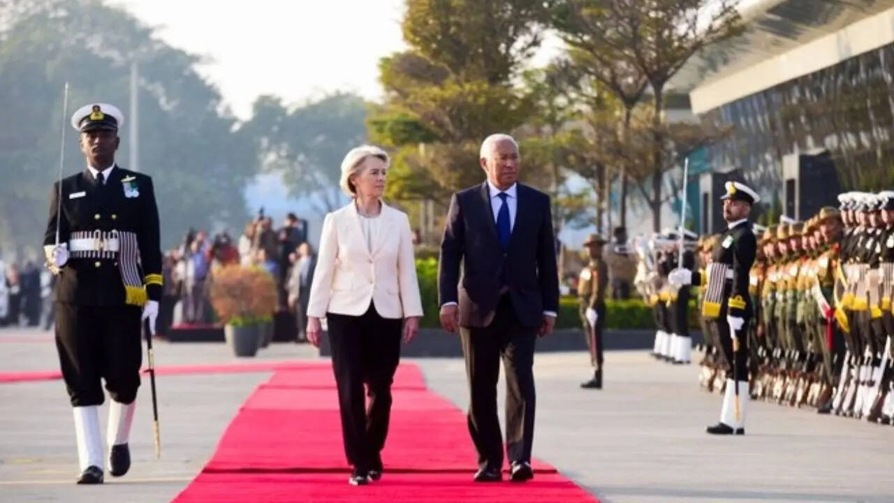 यूरोपीय परिषद के अध्यक्ष एंटोनियो लुइस सैंटोस दा कोस्टा और यूरोपीय आयोग की अध्यक्ष उर्सुला वॉन डेर लेयेन का रविवार को भारत आगमन पर भव्य स्वागत किया गया। दोनों नेताओं को दिल्ली पहुंचने पर गार्ड ऑफ ऑनर दिया गया।