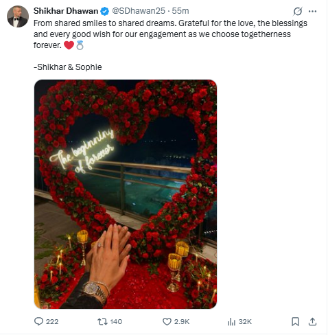 स्पोर्ट्स डेस्क, नई दिल्ली। भारत के पूर्व सलामी बल्लेबाज शिखर धवन ने गर्लफ्रेंड सोफी शाइन के साथ सगाई कर ली है। यह जानकारी धवन ने सोमवार को सोशल मीडिया के जरिए फैंस को दी। शिखर धवन ने इंस्टाग्राम और एक्स हैंडल पोस्ट में एक तस्वीर शेयर की, जिसमें धवन के साथ सोफी के हाथ नजर आ रहे हैं। इस तस्वीर में शाइन की उंगली पर इंगेजमेंट रिंग भी नजर आ रही है।