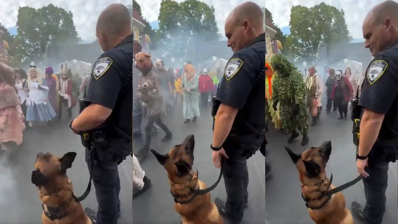 हेलोवीन का त्योहार पश्चिमी देशों में बहुत धूमधाम से मनाया जाता है। इस त्योहार के दौरान लोग डरावने और मजेदार कॉस्ट्यूम्स पहनकर अलग-अलग पार्टियों में जाते हैं। हेलोवीन से ही जुड़ा एक वीडियो इस वक्त जमकर वायरल हो रहा है, जिसमें देखा जा सकता है कि एक प्यारा सा कुत्ता सड़क किनारे एक पुलिस अफसर के साथ खड़ा है। सड़क पर कुछ लोगों का झुंड डरावने कॉस्ट्यूम्स पहनकर निकला हुआ है। शायद वे किसी परेड का हिस्सा हों और शहर का लॉ एंड ऑर्डर मेंटेन करने के लिए शायद उस कुत्ते और पुलिस अफसर की ड्यूटी वहां लगी हो।