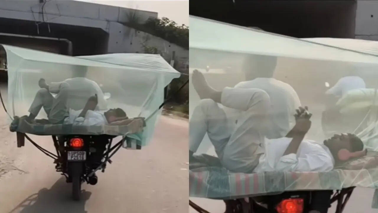 वायरल हो रहे इस जुगाड़बाजी वाले वीडियो में देखा जा सकता है कि एक चलती बाइक पर चारपाई बंधी हुई है और उस पर मच्छरदानी भी लगी हुई है। इतना तो ठीक था लेकिन इस वीडियो को देखकर हैरानी तब हुई जब उस चारपाई पर एक बंदे को लेटा हुआ पाया गया। वीडियो में आप देख सकते हैं कि एक लड़का चारपाई पर लेटा हुआ है और मस्त मोबाइल चलाते हुए बढ़िया चिल कर रहा है। वहीं, उसका दोस्त बाइक चला रहा है। दोनों बड़े ही आराम से सड़क पर बाइक चलाते हुए जा रहे हैं।