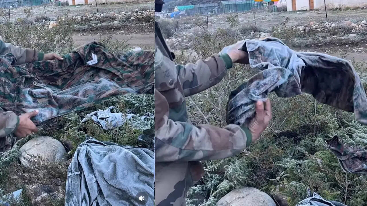 आप देख पाएंगे कि जब सेना का जवान अपनी वर्दी लेने वापस जाता है तो वर्दी पूरी तरह जम जाती है। ऐसा लगता है कि वर्दी किसी पापड़ की तरह कड़ी हो गई हो। यह देखकर जवान को यकीन नहीं होता है। वह अपने एक साथी से बात करते हुए कहता है कि उसने सोचा था कि वर्दी सूख जाएगी लेकिन यह तो अब पहनने लायक भी नहीं है। वीडियो को mr_sandi_koli नाम के इंस्टाग्राम अकाउंट से शेयर किया गया है। वीडियो शेयर करने के साथ यूजर ने लिखा- अरे यार ये क्या हो गया। वीडियो सामने आने के बाद यूजर्स तरह-तरह के कमेंट कर रहे हैं। एक यूजर ने लिखा- 'सर्दी को झेलना हर किसी की वश की बात नहीं, जवान और किसान ही झेलना सकता है, जय जवान जय किसान।'