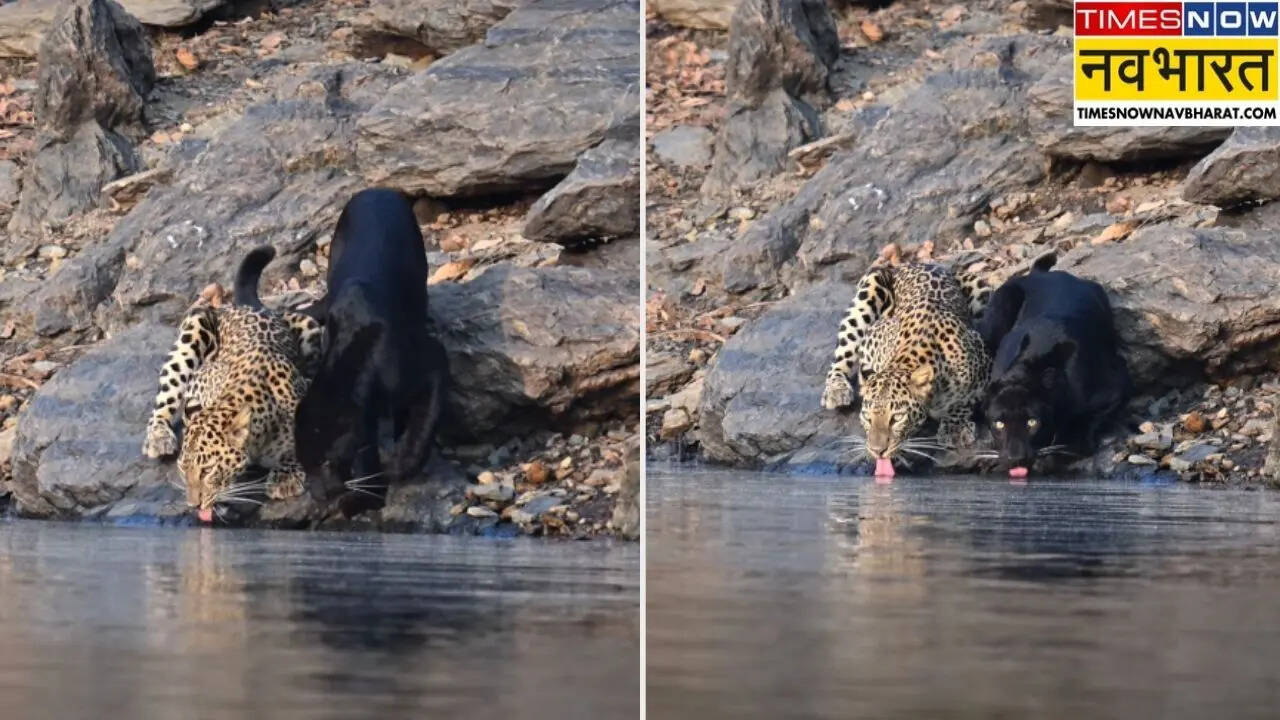 एक वाइल्डलाइफ फोटोग्राफर ने एक तेंदुआ और ब्लैक पैंथर को साथ-साथ पानी पीते हुए नजारे को अपने कैमरे में कैद कर लिया। जिसका वीडियो अब सोशल मीडिया पर जमकर वायरल हो रहा है।