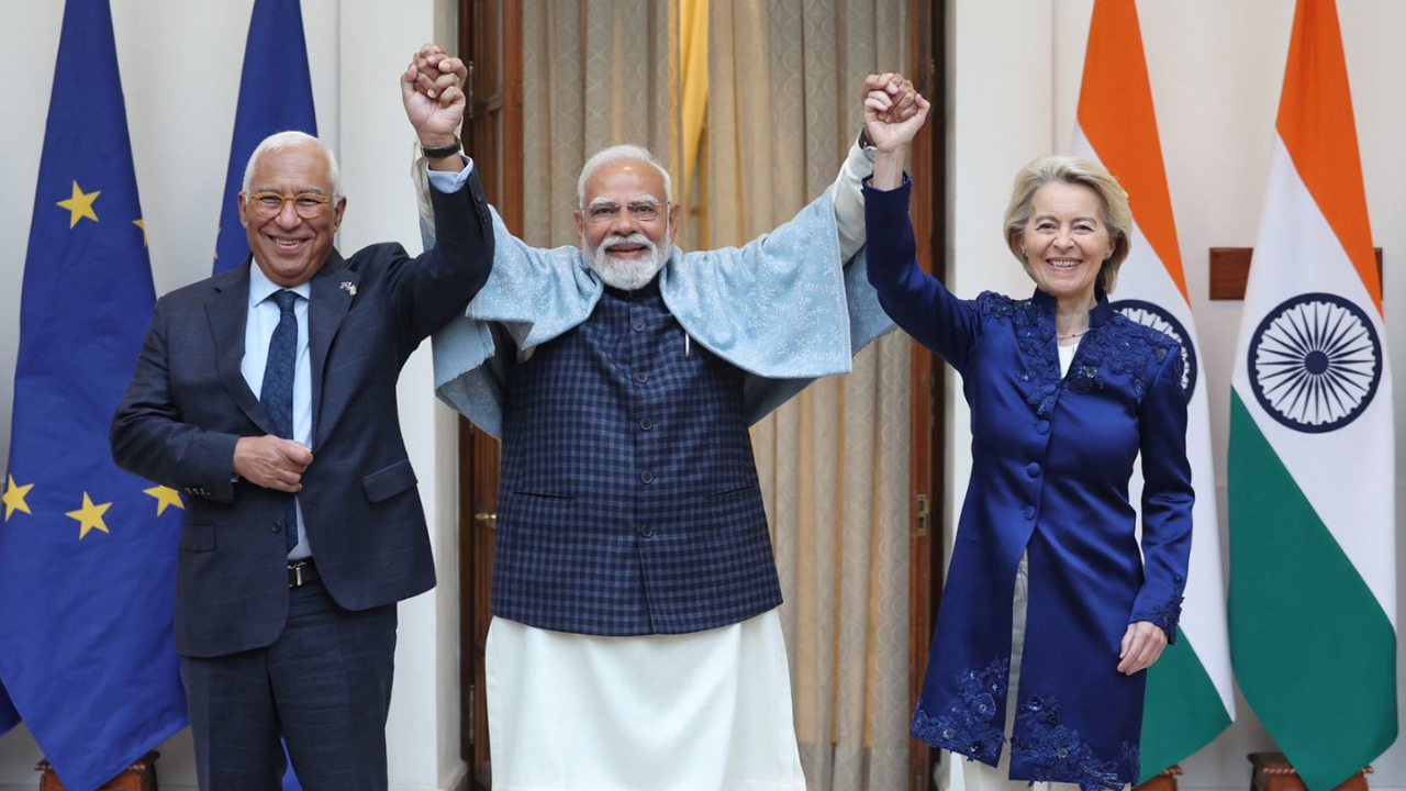 वाणिज्य मंत्री पीयूष गोयल और व्यापार एवं आर्थिक सुरक्षा के लिए यूरोपीय आयुक्त मारोस सेफकोविक ने प्रधानमंत्री नरेंद्र मोदी, यूरोपीय आयोग की अध्यक्ष उर्सुला वॉन डेर लेयेन और यूरोपीय परिषद के अध्यक्ष एंटोनियो कोस्टा की उपस्थिति में संयुक्त घोषणा पर हस्ताक्षर किए। वॉन डेर लेयेन ने इसे "सभी समझौतों की जननी" (the mother of all deals) बताते हुए कहा, हम 2 अरब लोगों का बाजार बना रहे हैं। यह दो दिग्गजों की कहानी है - दुनिया की दूसरी और चौथी सबसे बड़ी अर्थव्यवस्थाएं। दो दिग्गज जिन्होंने वास्तव में पारस्परिक लाभ के दृष्टिकोण से साझेदारी को चुना है। यह एक सशक्त संदेश है कि वैश्विक चुनौतियों का सबसे अच्छा समाधान सहयोग है।
